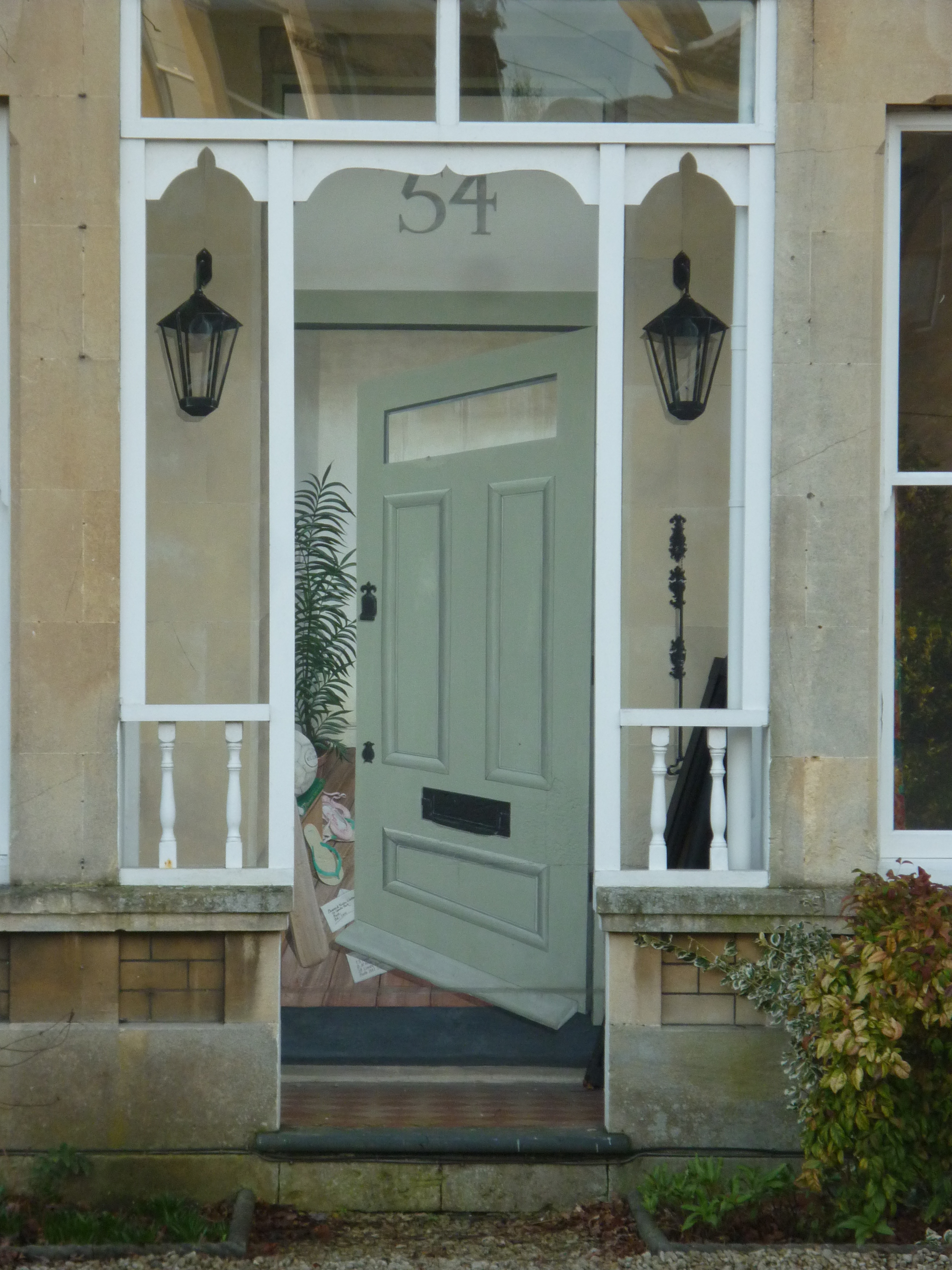 In case it’s not clear the open door is painted, the real wooden arch leads onto a porch with the actual doors to two semi-detached houses to the left and right.