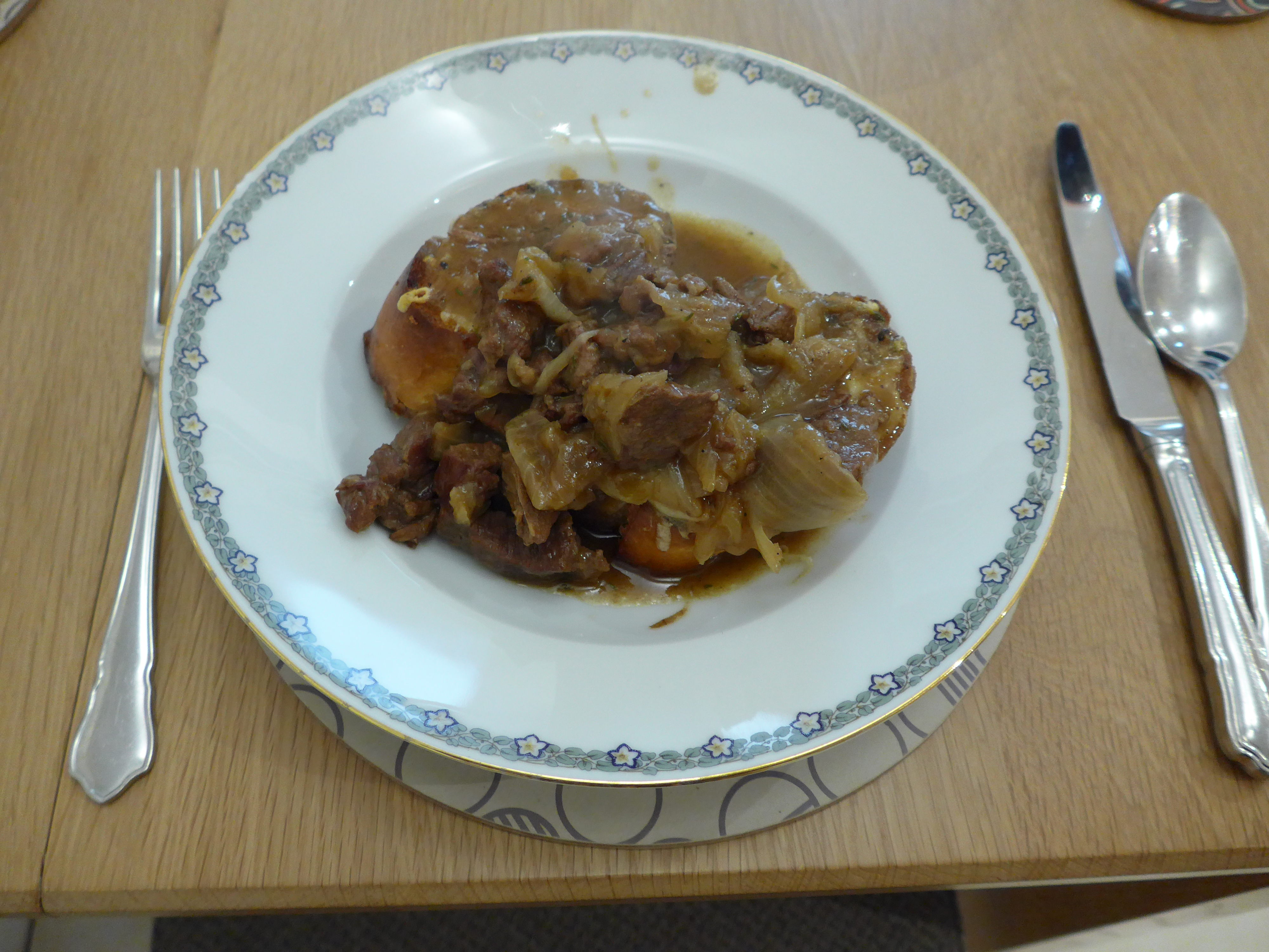 The dish is served with slices of french bread covered in Gruyere cheese as you would with French Onion Soup and the end result was delicious, the beef in particular being tender and very tasty. And there’s enough left over to have some more tomorrow!