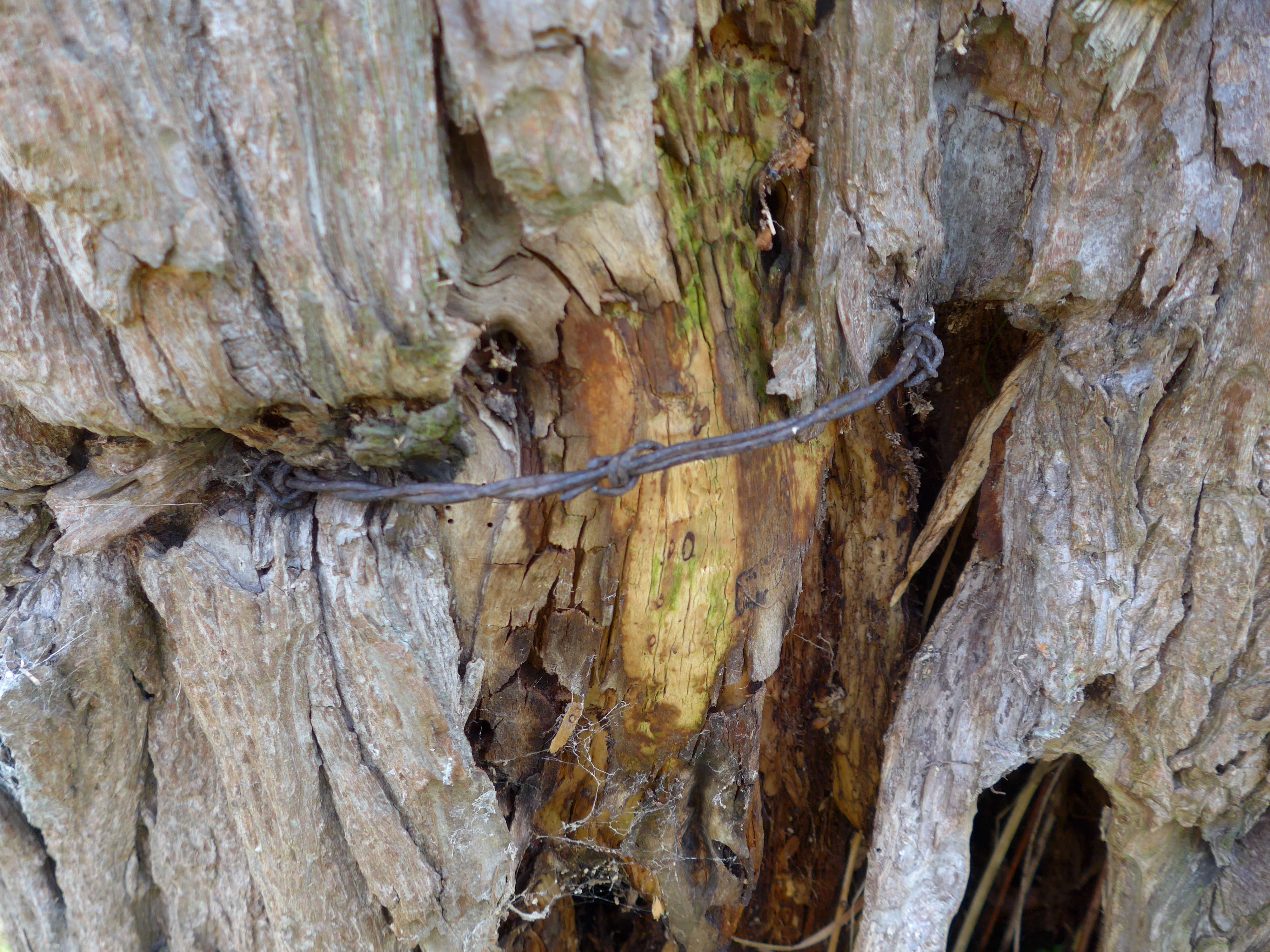 Came across this. It is almost surreal, a tree had barbed wire wrapped round it and over the years has grown and grown so that now the wire is in the tree itself. Sad really that no one saw what was going on and cleared the wire but the tree seems to be doing OK.