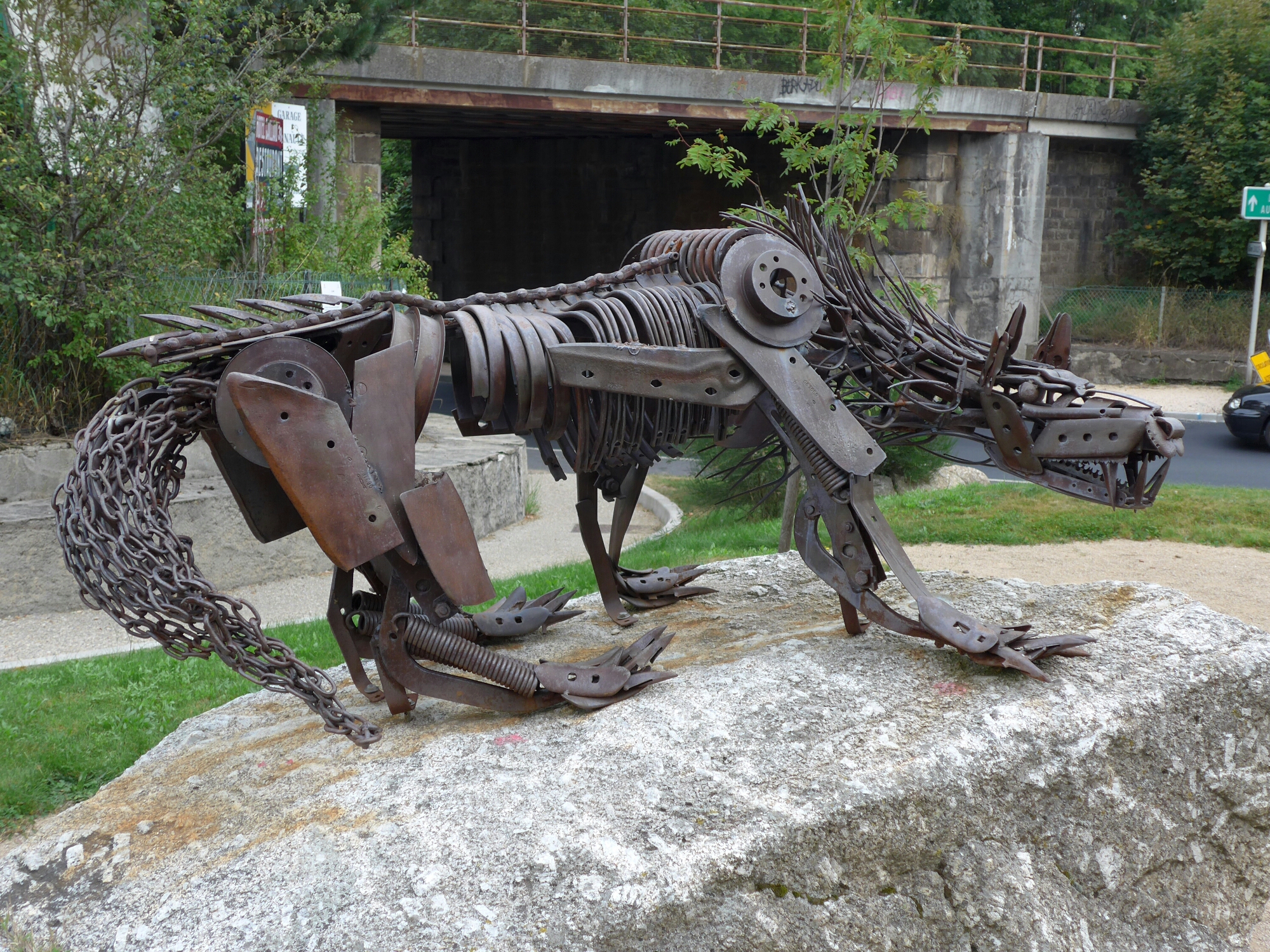 I should say a few words about the Beast of Gevaudan as this is the area it roamed and terrorised. Nobody can quite tell you what it was, it was a bit like a wolf but wasn’t exactly a wolf; you get the idea. I believe it was killed in the eighteenth century but lives on as posters, postcards, models etc. etc.. Here it is represented in scrap metal.