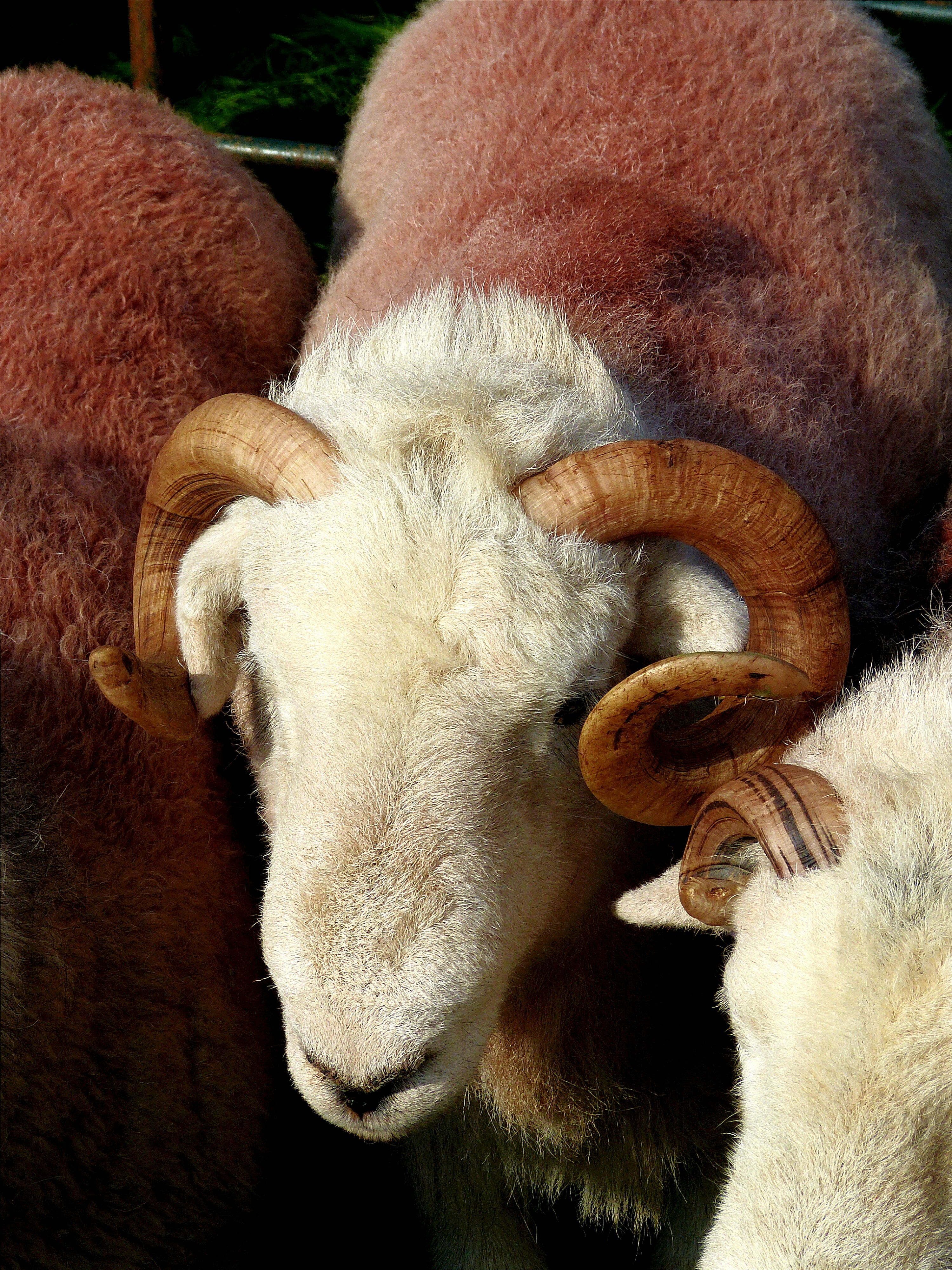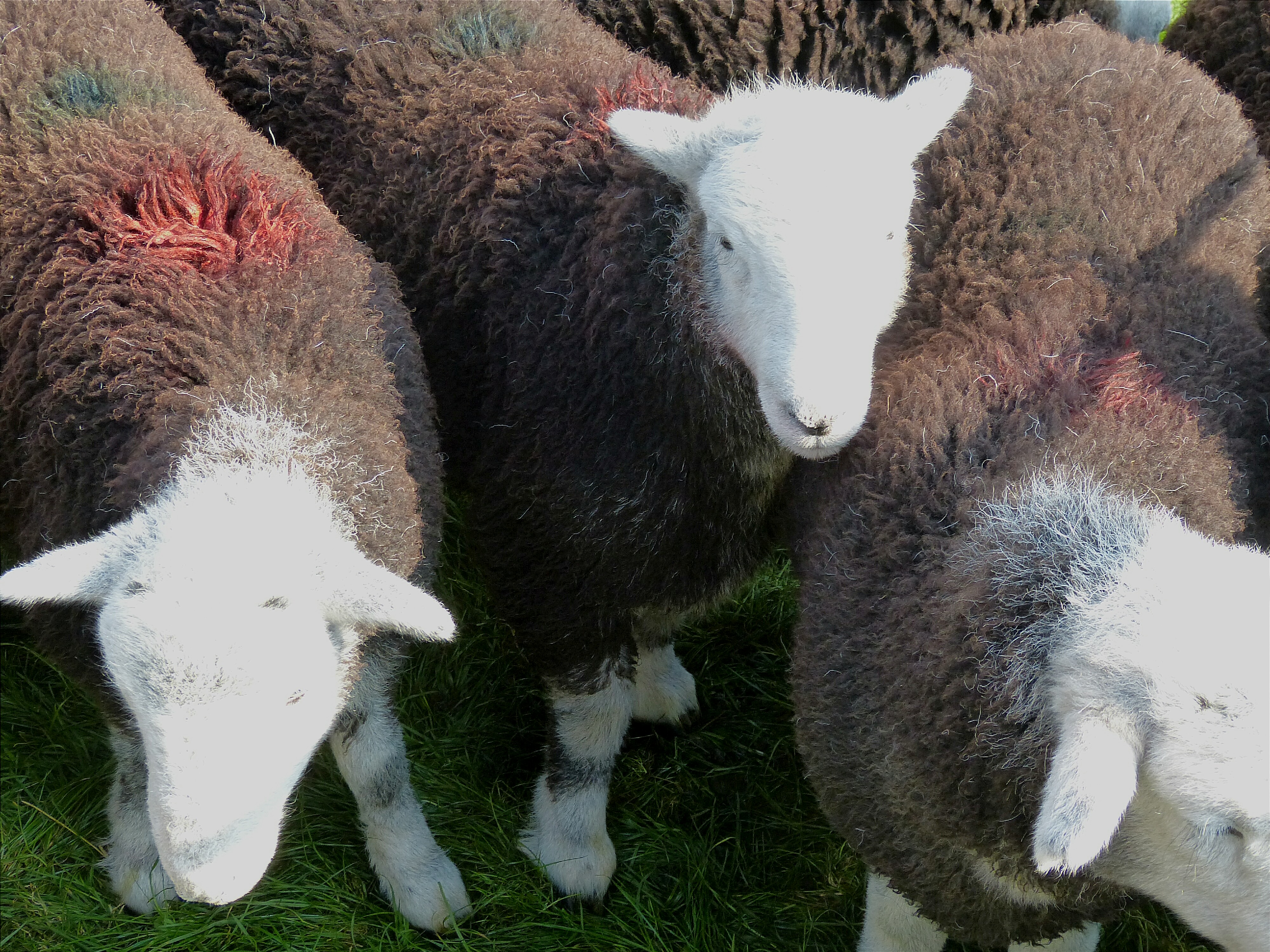 In the picture you can see that the competitors’ fleeces have been “redded” which is a tradition for Herdwick competitions going back into the mists of time but still continued today. Showing can be an anxious time for the handlers