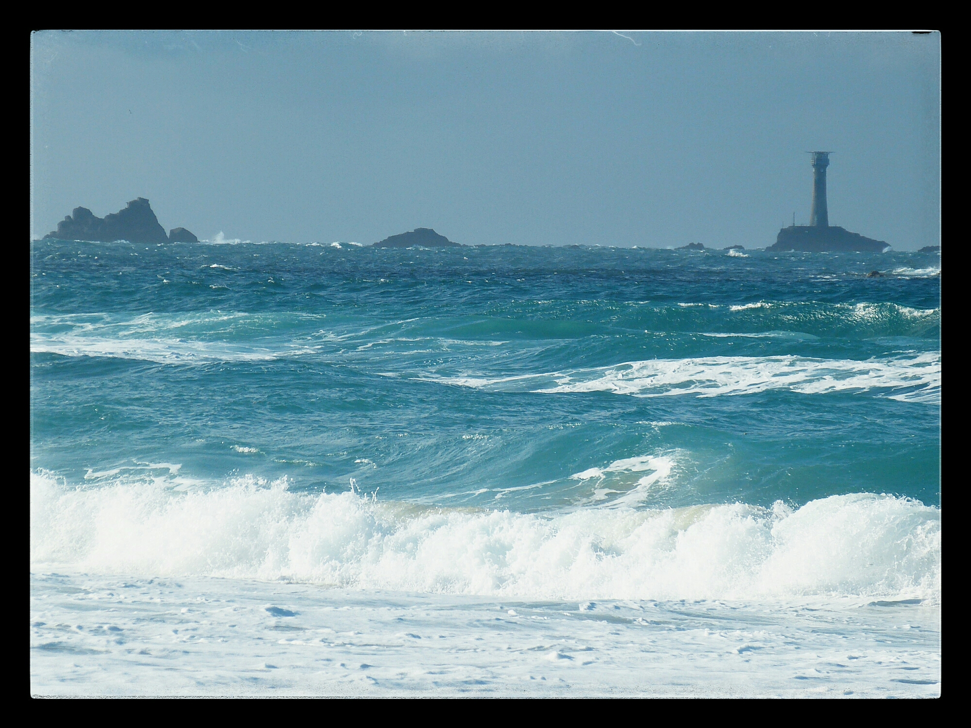 Off the southwest tip of England are three famous lighthouses that warn mariners of dangerous rocks: Longships, Wolf Rock and Bishop Rock. This picture shows the Longships Rocks and Lighthouse and was taken from Sennen Cove. The other two lights are too far out to sea to see.