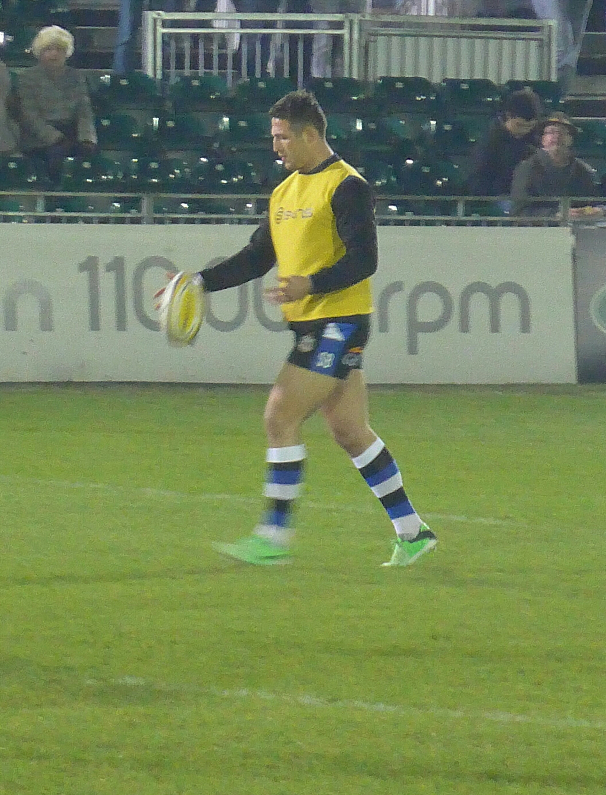 Following surgery and recovery he has been training and learning the new code of Union. We weren’t expecting to see him quite yet but he played tonight for about the final half hour against Harlequins. He’s certainly very keen and looks as though he’s the real deal but a wet Friday night in Bath wasn’t easy for him.