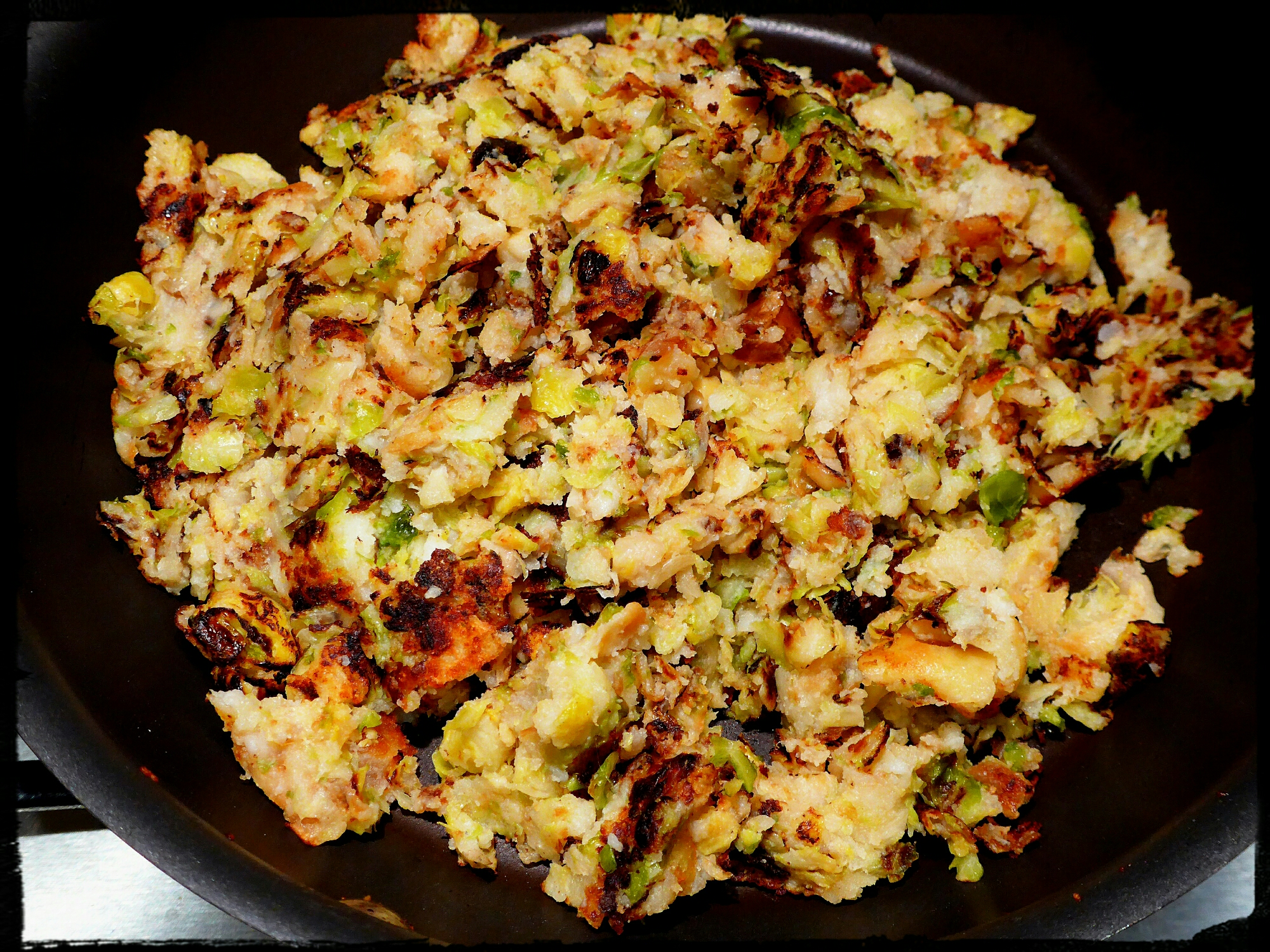 Bubble and Squeak is a delicious mélange of cooked potatoes and cooked sprouts. It’s best to leave them for a couple of days to mature before making B & S but then take your potatoes and break them up, I use my hands, to separate the crisp outside from the soft and floury inside; I then chop the Brussels and use the side of the blade to squash them down a bit.