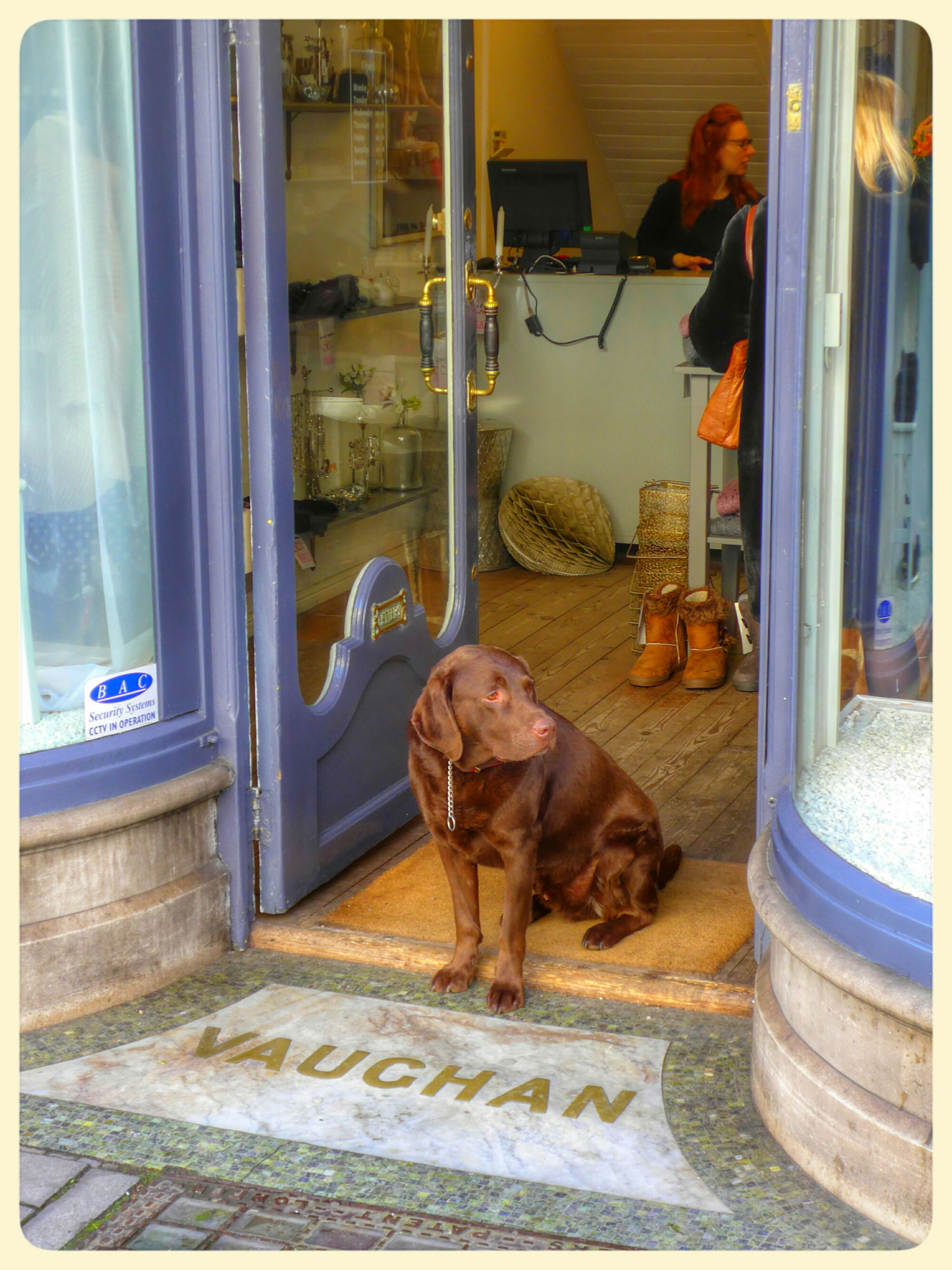 I recently saw one shop where all the customers are routinely vetted by the resident dog before being allowed in; here he is on guard duty.