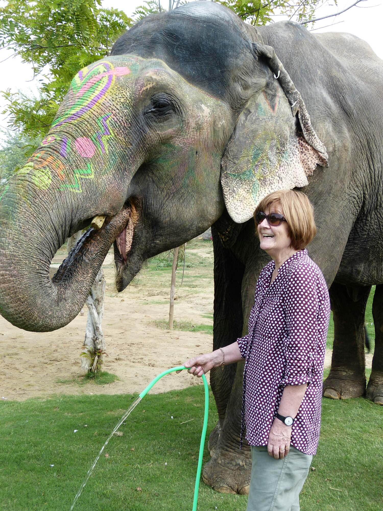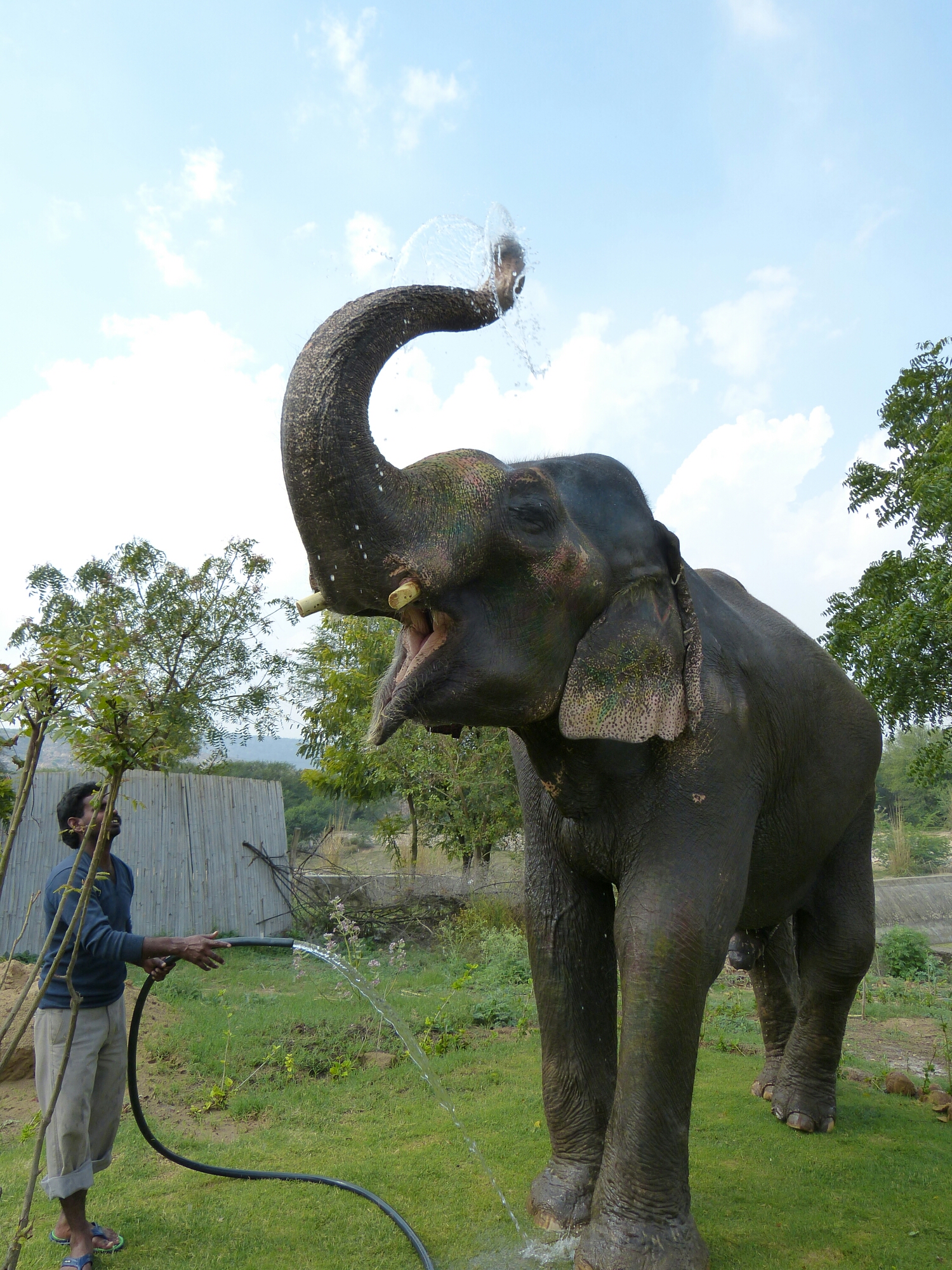 So poor in fact that the only thing left was to wash it all off. But first he needed a drink. For this you aim the water from a hose into the tip of his trunk which he sort of sniffs up into it’s full (about eight litres) then the trunk comes round into his mouth and he blows it all in, accompanied by the most amazing sound effects of gurgles and wheezes.