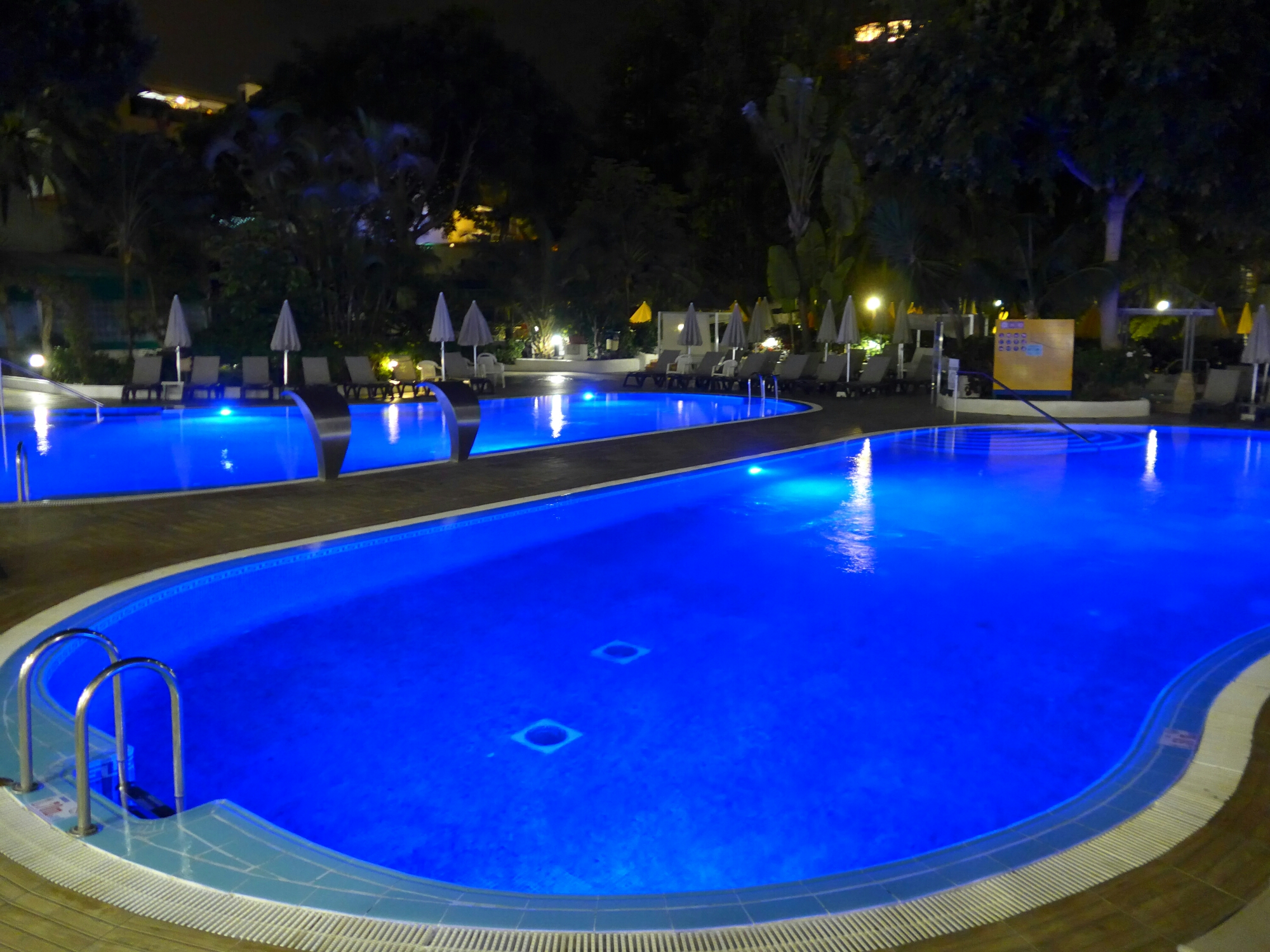The hotel swimming pools by night, no one swimming. Pfft.