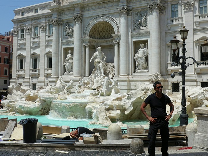 The last thing on our hit list for today was to visit the Trevi Fountain and throw in some coins to make it certain that we will return to the Eternal City and it just happened to be on the way back to the hotel. Soon we encountered yet another huge crowd but turned a corner and there it was, surrounded by fencing as it is being cleaned and refurbished; so even without the coins we’ll have to come back to see both things properly with normal access. Anyway here it is.