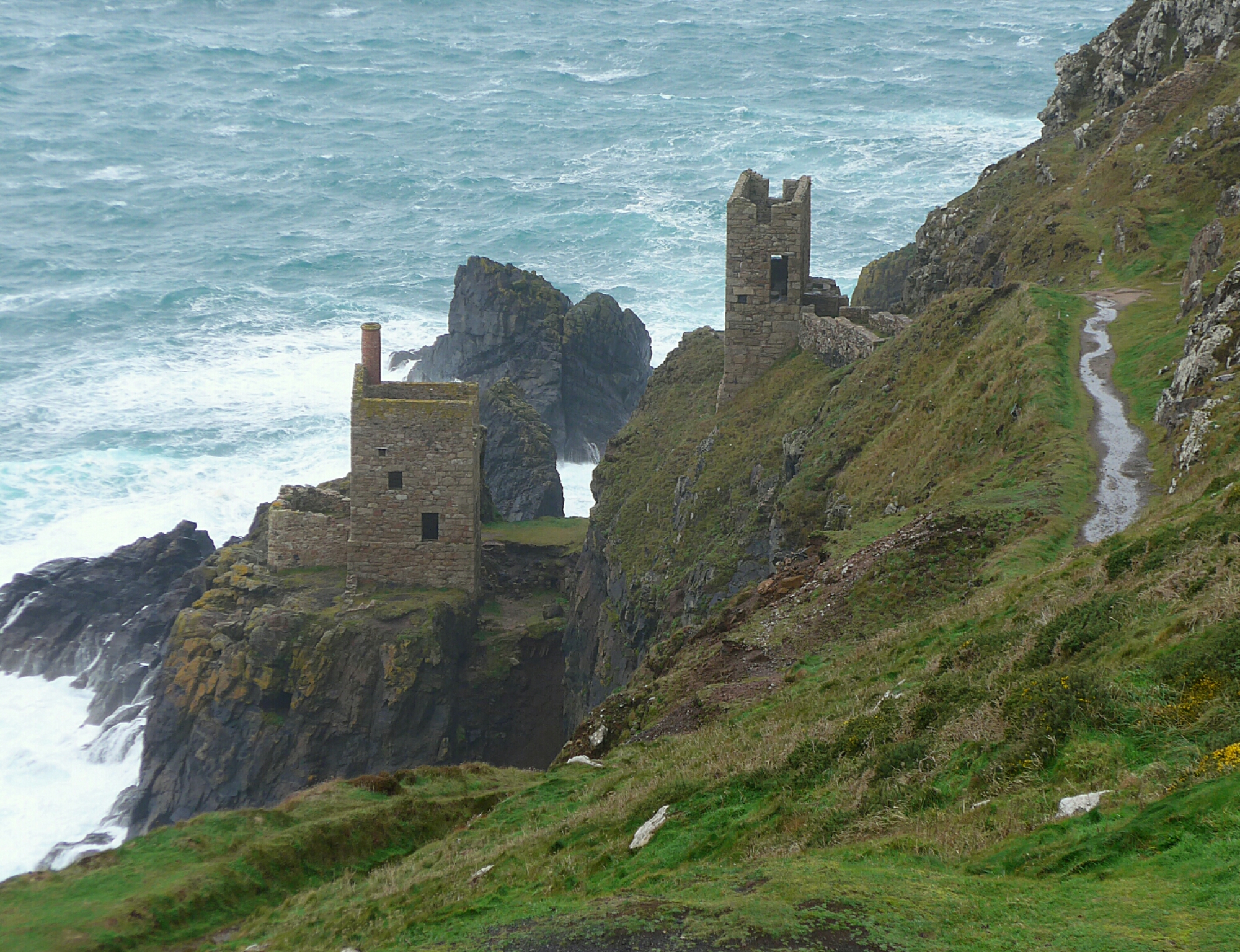 After this we were heading back but as it was still dry we drove along the North coast road and parked to walk along the coast path to have a look at probably the most dramatic historic mining site in Cornwall, the Crowns Mine at Botallack. This is one of the mines where the seams went out to sea and the miners could hear the stones being dragged along the seabed above their heads by the tide. Some of them leaked too.