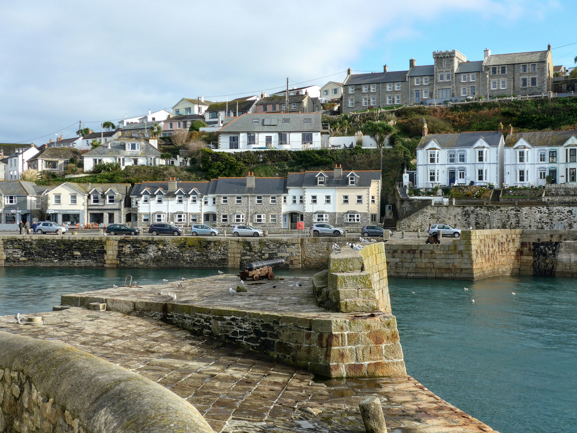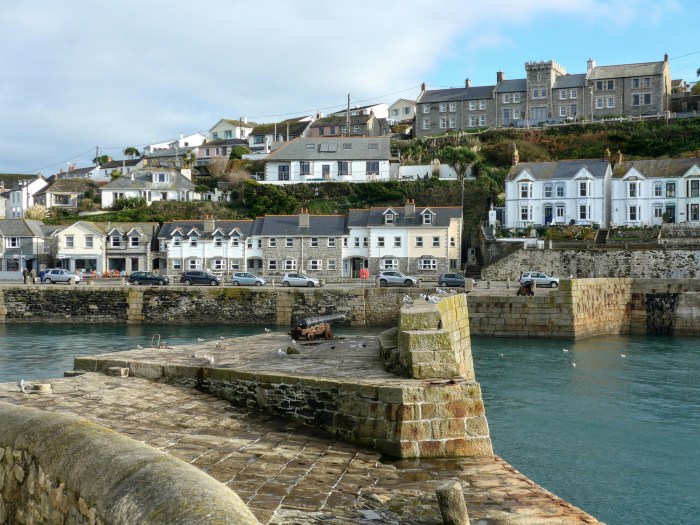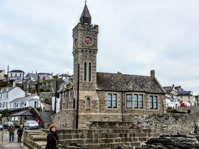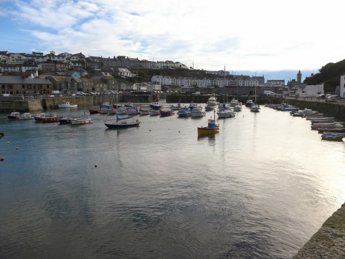 After a leisurely breakfast and a dog walking in dry conditions we set off to Porthleven a town a little way round Mounts Bay heading South towards the Lizard. Porthleven is the town you always see pictures of when there are big gales in the South-West as the seas break spectacularly over the clock tower by the harbour, this one.