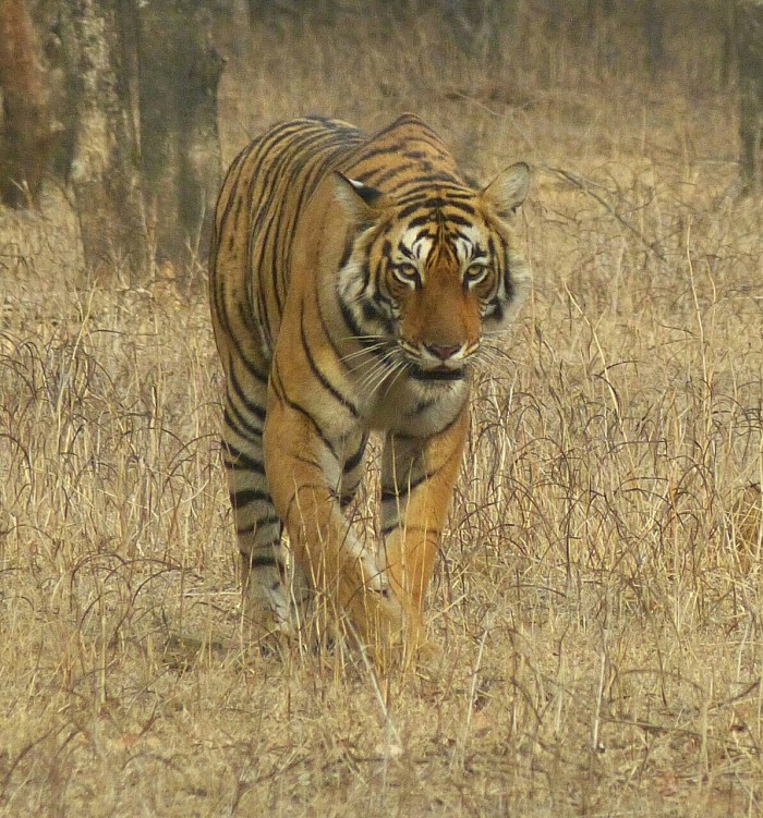Early morning is such a beautiful time of day in the park and we were really enjoying a gentle drive round when suddenly there was a tiger walking along beside us about thirty yards away. I grabbed some pictures as we quickly drove ahead and round in front of where she was headed. We parked with about four other Jeeps as she walked towards us, completely unconcerned by our presence.