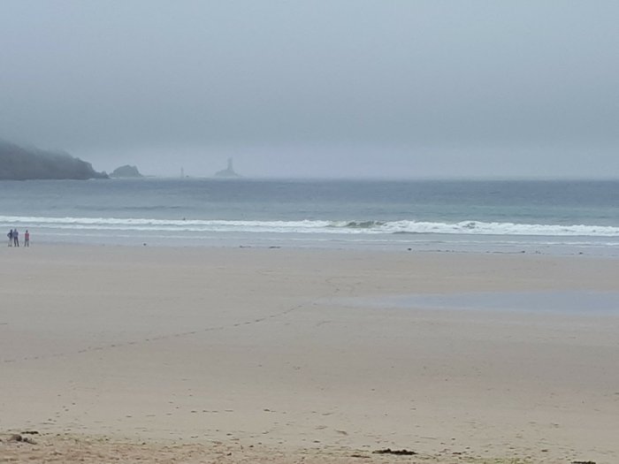 Today we set off to the outermost end of the earth, France’s answer to Land’s End, this is Finisterre after all, to a place called Pointe du Raz. Here we are promised “…deafening surf- roar and to look out towards the impressive sequence of lighthouses that march towards the horizon.” *Rough Guide* In fact what we got was this