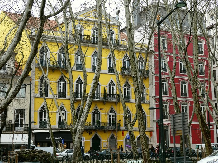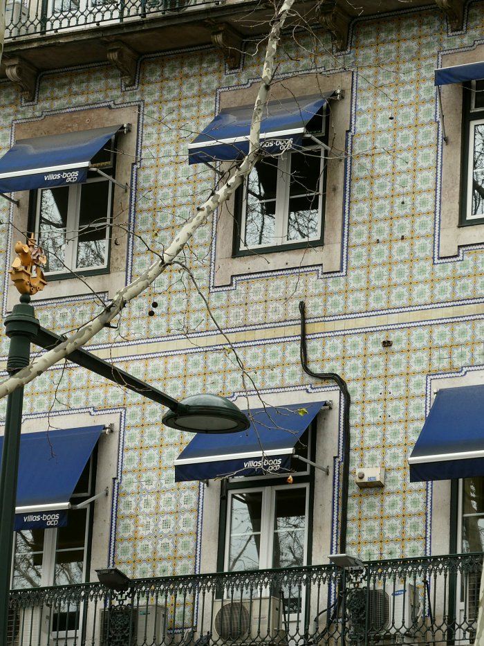 To our delight it had stopped raining when we came outside so we got off the Metro at the bottom of the Avenida da Liberdade, one of Lisbon most impressive streets, to walk back to our hotel. Photographic opportunities have been a bit limited by rain and very dull light but here are a couple showing some of the colourful and tiled houses typical of the city.