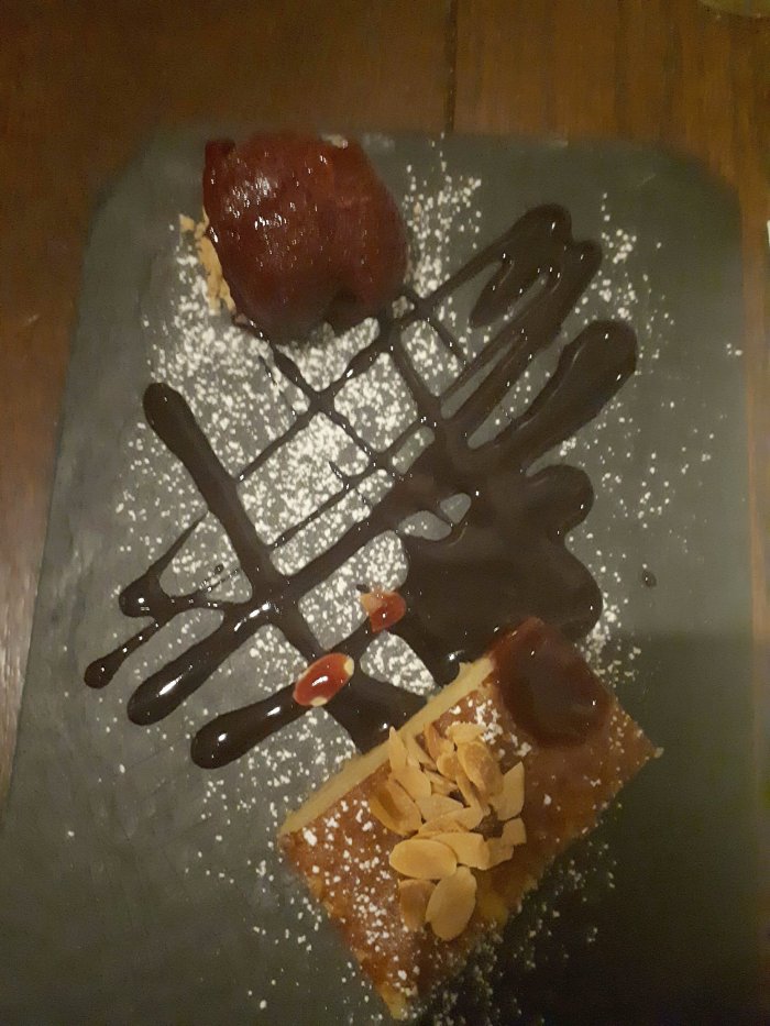 For our last dinner in Lisbon we wanted something really nice; we are lucky to have neighbours who know Lisbon well so our thanks to Lizzie and Ryan for suggesting The Decadente bar and restaurant. Knowing it’s a popular place I phoned and booked a table and mentioned where we were walking from, the young lady said it was only about fifteen minutes on foot. What she didn’t tell us, and what I didn’t pick up from the map, was that the restaurant is on the Barrio Alto right at the top of the Elevador da Glória funicular from yesterday. Don’t ask why but, yes, we did walk up and the restaurant is just at the top. It’s a very chic and popular place and the food was outstanding, Mrs Sixwheeler had a steak and I had pork. The desserts were sensational, here’s Mrs S’s which she rates as one of the best ever.