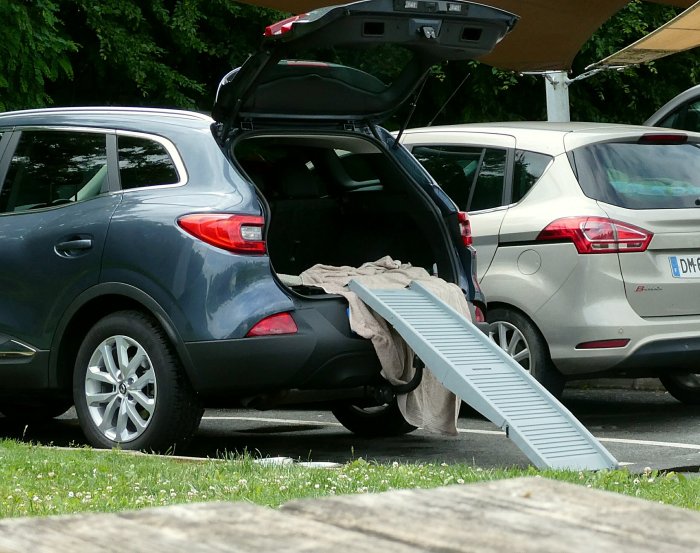 It did at least stop for a while so we stopped for a bit of lunch at a motorway services; in the parking was a car with a stout and elderly dog whose owners had equipped it with an access ramp which I thought was rather sweet.