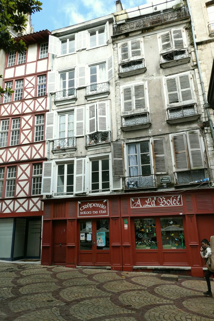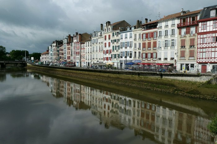 The houses on the riverbank are typical of Bayonne which typically has narrow streets and little squares