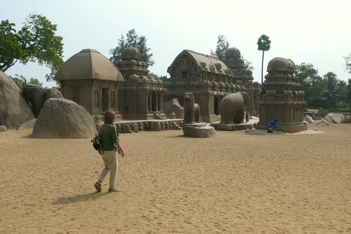 These are the “Five Rathas” which were carved from a single gigantic boulder by three generations of the same family over a period of one hundred and ten years and shows evolution of the local Dravidian style of carving.